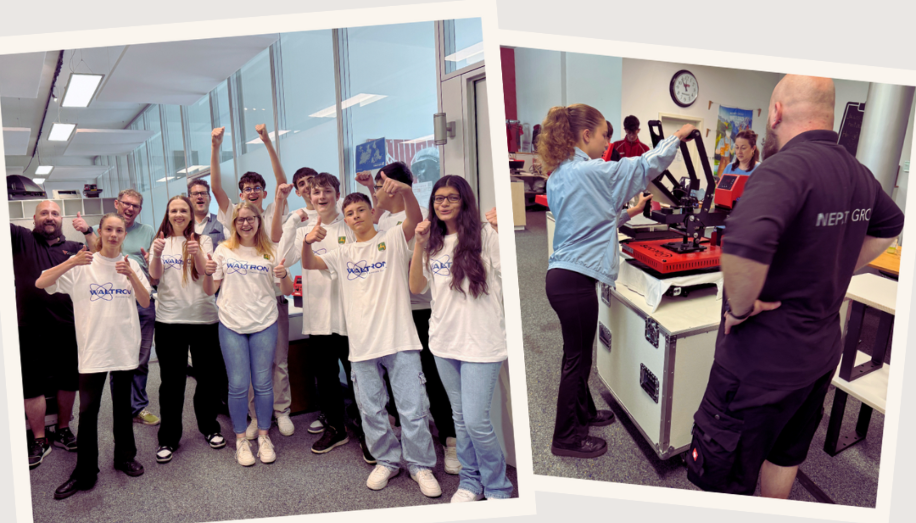 Kürzlich hatten wir die Freude, zehn engagierte Achtklässler der Mittelschule Wolnzach in unserem DTF-Schmiede Studio zu begrüßen. Mit Unterstützung unseres Teams konnten die Schüler ihre eigenen T-Shirts im neuesten DTF-Verfahren (Direct-to-Film) bedrucken. Diese Erfahrung brachte ihnen nicht nur Spaß, sondern auch wertvolle Einblicke in die Welt der Textilveredelung. Die Vorderseite der T-Shirts ziert das Wolnzach-Wappen und das Logo der Firma Waltron, Hauptsponsor des Abschlusslaufs, während der Rücken den motivierenden Spruch „Mit der Mittelschule auf die Zielgerade“ trägt.
